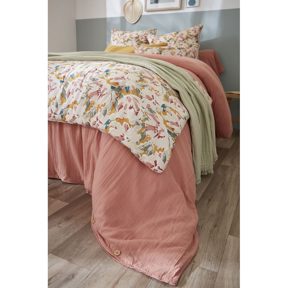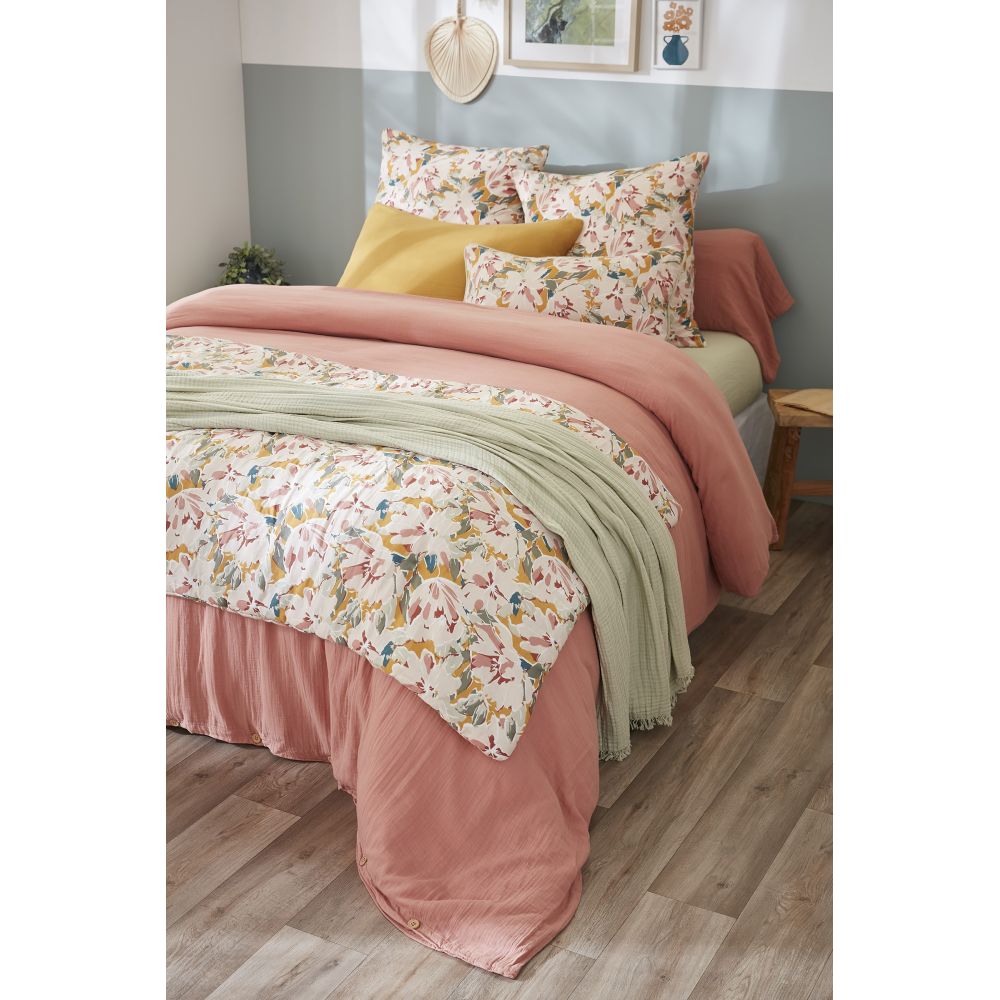 Enveloppe : 100% Coton Double gaze de coton 125 gr/m² - Garnissage : 100% Polyester 300 gr/m² - 90x200 cm - Passepoil - Lavable à 30°C (avec des couleurs similaires) - Essorage doux - Pas de sèche linge - Pas de repassage