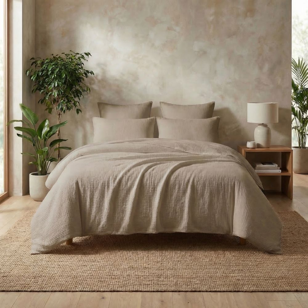 100% Coton Quadruple gaze de coton 220 gr/m² - 240x220 cm Ouverture à boutonnières + boutons bois Lavable à 40° C (avec des couleurs similaires) - Essorage doux - Sèche linge possible - Pas de repassage