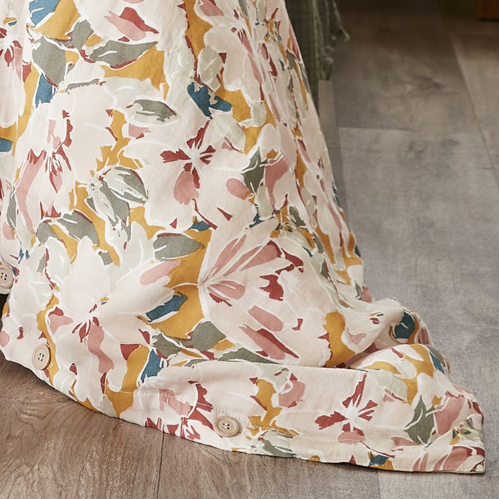 100% Coton Double gaze de coton 125 gr/m² - 200x200 cm Ouverture à boutonnières + boutons bois Lavable à 40° C (avec des couleurs similaires) - Essorage doux - Sèche linge possible - Pas de repassage