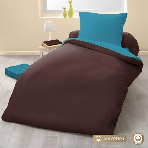Parure de couette 140x200 100% Coton 57 fils Choco/Turquoise. Parure de lit 2 pièces Coton 140x200 Choco/Turquoise comprenant : housse de couette 140 x 200 cm 1x taie d'oreiller 63 x 63 cm
