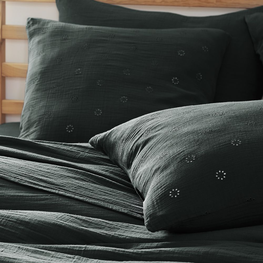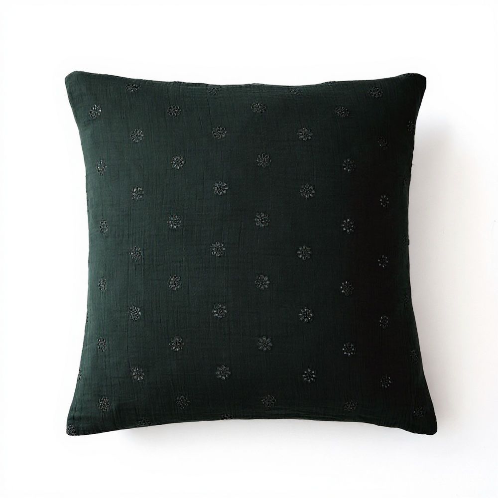 100% Coton Double gaze de coton 125 gr/m² - 60x60 cm Ouverture portefeuille avec rabat - Broderies anglaises Lavable à 40° C (avec des couleurs similaires) - Essorage doux - Sèche linge possible - Pas de repassage